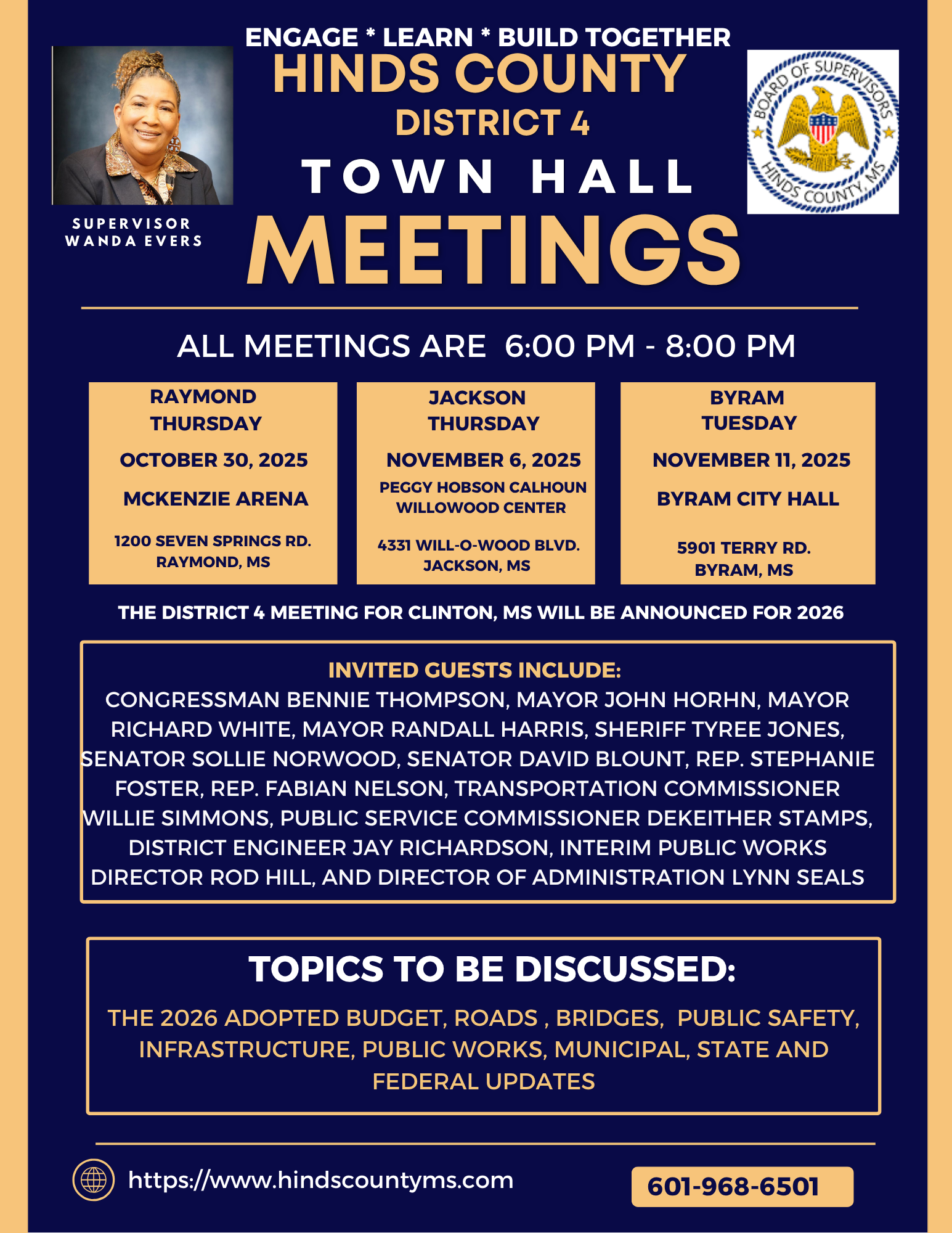 Join Supervisor Wanda Evers for one of the three town hall meetings. Engage * Learn * and Build Together.